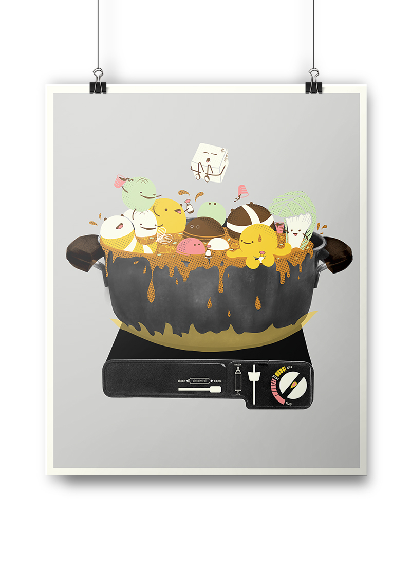 big pot of boiling stock that sits on top of a butane gas stove. My imagination took over and this is the result.