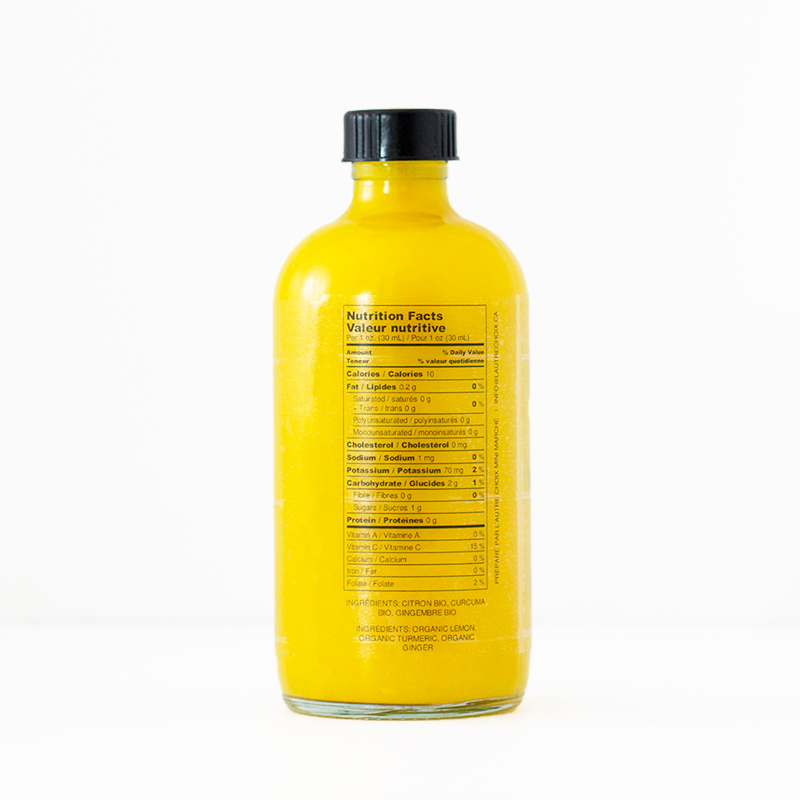Un Once Par Jour, or as it is called in English, One Ounce A day, is an immune boosting tonic made from ginger, lemon and turmeric, giving the bottle its vibrant yellow. To let the colour do most of the talking, the graphics and typography were kept direct, uncomplicated, and easy to read.